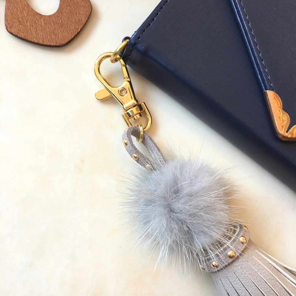 ミンクのファーボールが温かい印象を与え、合成皮革のタッセルでシックなチャームに仕上げました♪