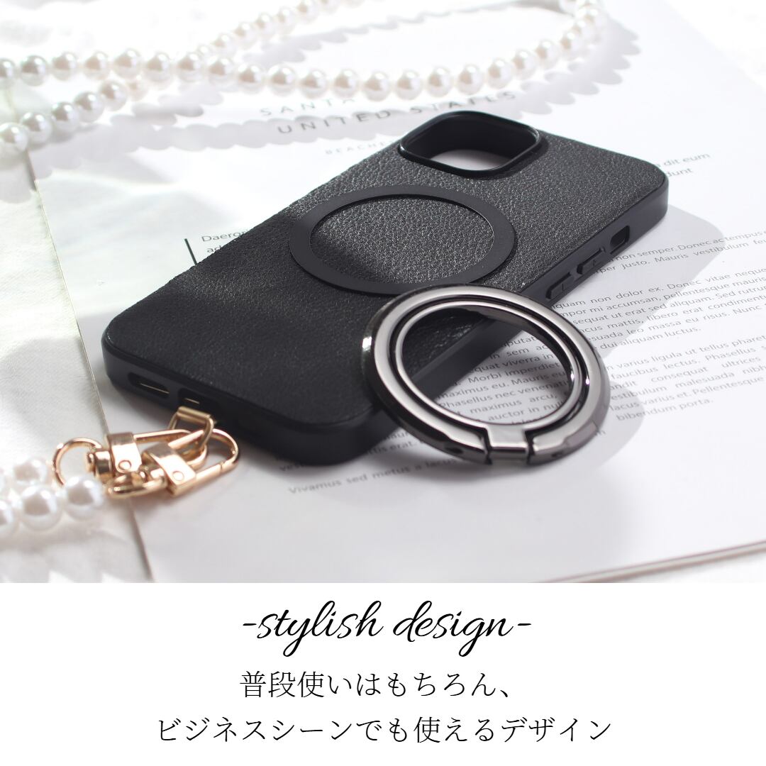 iphone ケース 本革 iphone16 iphone15 iphone14 iphone13 リング付き パール ストラップ レザー 16 15 14 13 13mini マグセーフ対応 magsafe対応 ゴートレザー 16e 16pro 15pro リング ストラップ付き 肩掛け スタンド マグネット 16プロ 13ミニ ブラック シンプル 送料無料