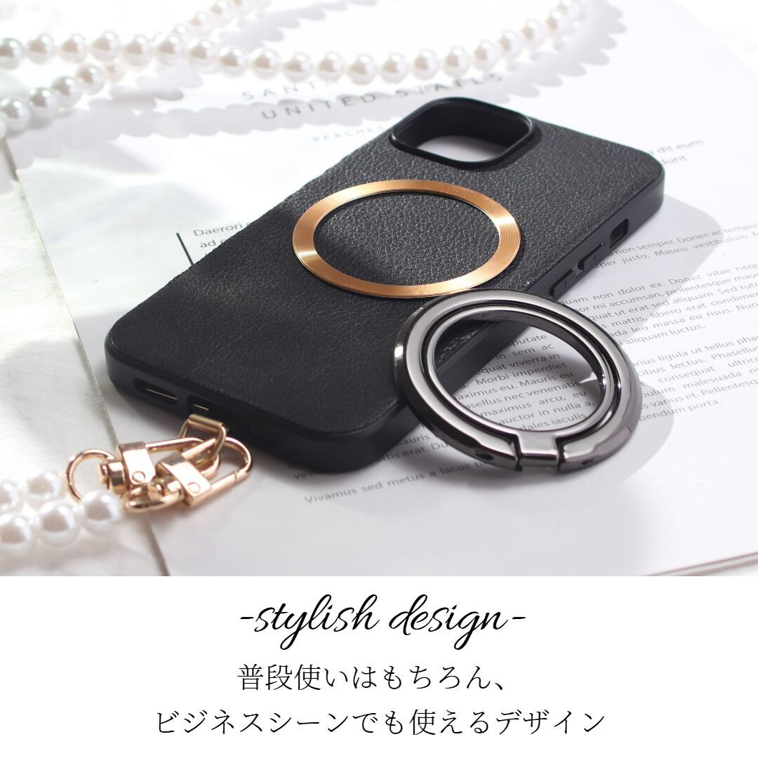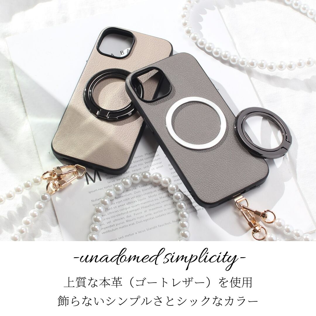 iphone ケース 本革 iphone16 iphone15 iphone14 iphone13 リング付き パール ストラップ レザー 16 15 14 13 13mini マグセーフ対応 magsafe対応 ゴートレザー 16e 16pro 15pro リング ストラップ付き 肩掛け スタンド マグネット 16プロ 13ミニ メタリック スリム 送料無料