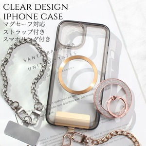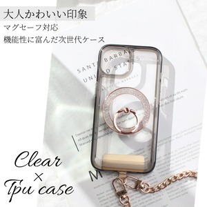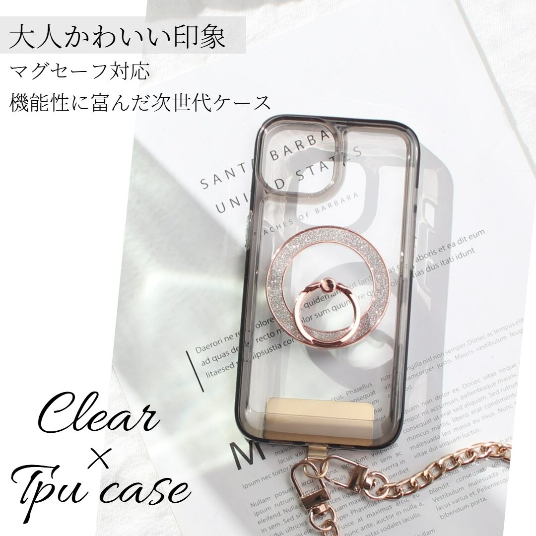 iphone ケース クリア リング付き iphone16 iphone15 iphone14 13 12 mini チェーン ストラップ magsafe マグセーフ マグネット アイフォン 16 15 14 SE 11 ショート ストラップ付き 16pro 15pro 14pro リング スタンド 13mini se3 se2 大人可愛い ラメ メタリック 送料無料