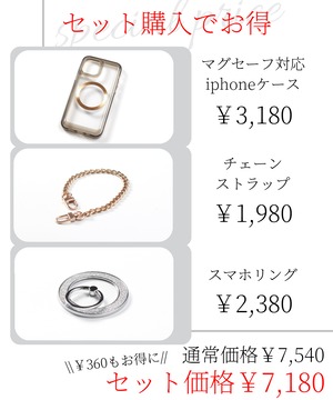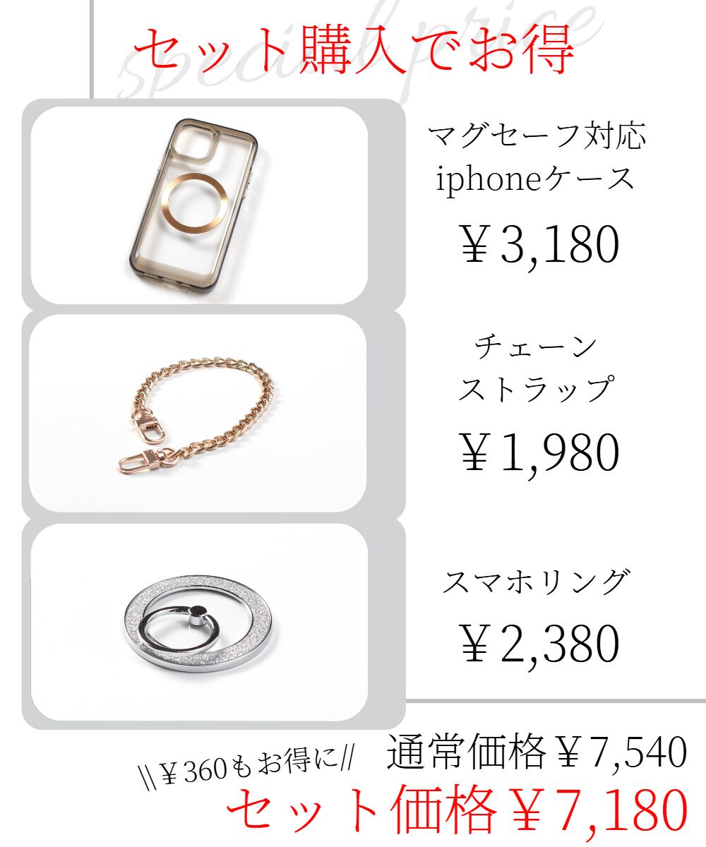 単体でマグセーフ対応iphoneケースとスマホリング・チェーンストラップを購入すると¥7,540ですが、