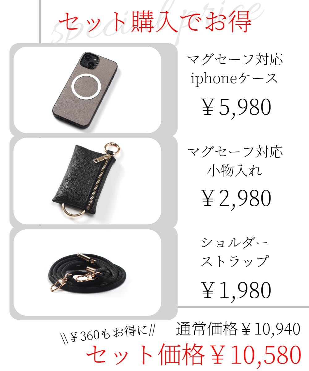 単体でマグセーフ対応iphoneケースと小物入れ・ショルダーストラップを購入すると¥10,940ですが、