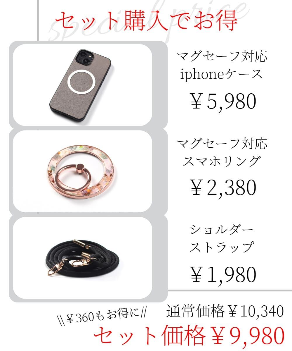 単体でマグセーフ対応iphoneケースとスマホリング・ショルダーストラップを購入すると¥10,340ですが、