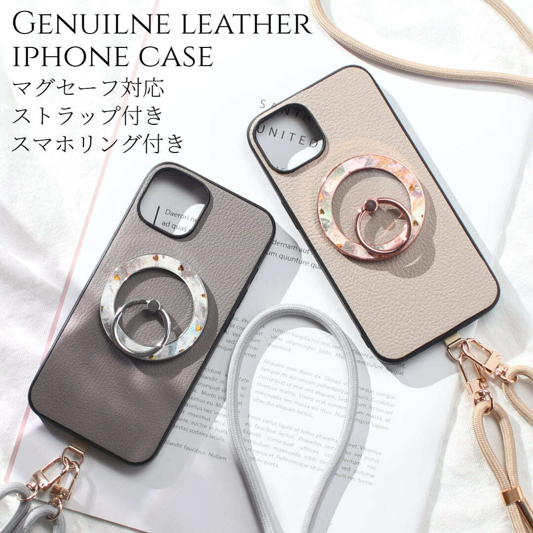 iphoneケース レザー リング付き iphone17 iphone16 iphone15 iphone14 ショルダー ストラップ 本革 17 16 15 14 13 mini マグセーフ magsafe スマホリング 花柄 ハート ラメ ゴートレザー 17pro 16pro 15pro リング ストラップ付き 肩掛け スタンド マグネット 送料無料
