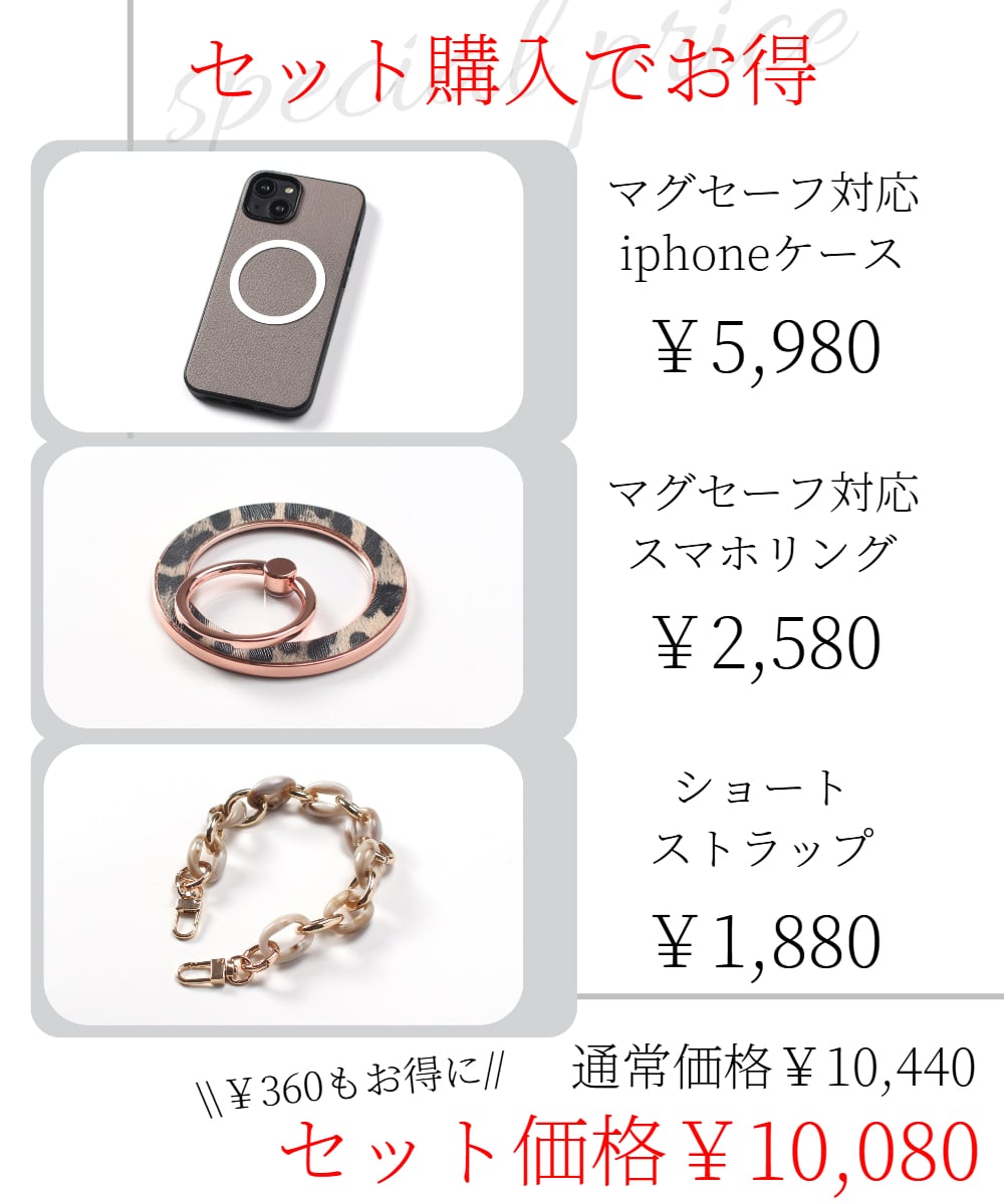 単体でマグセーフ対応iphoneケースとスマホリング・ショートストラップを購入すると¥10,440ですが、