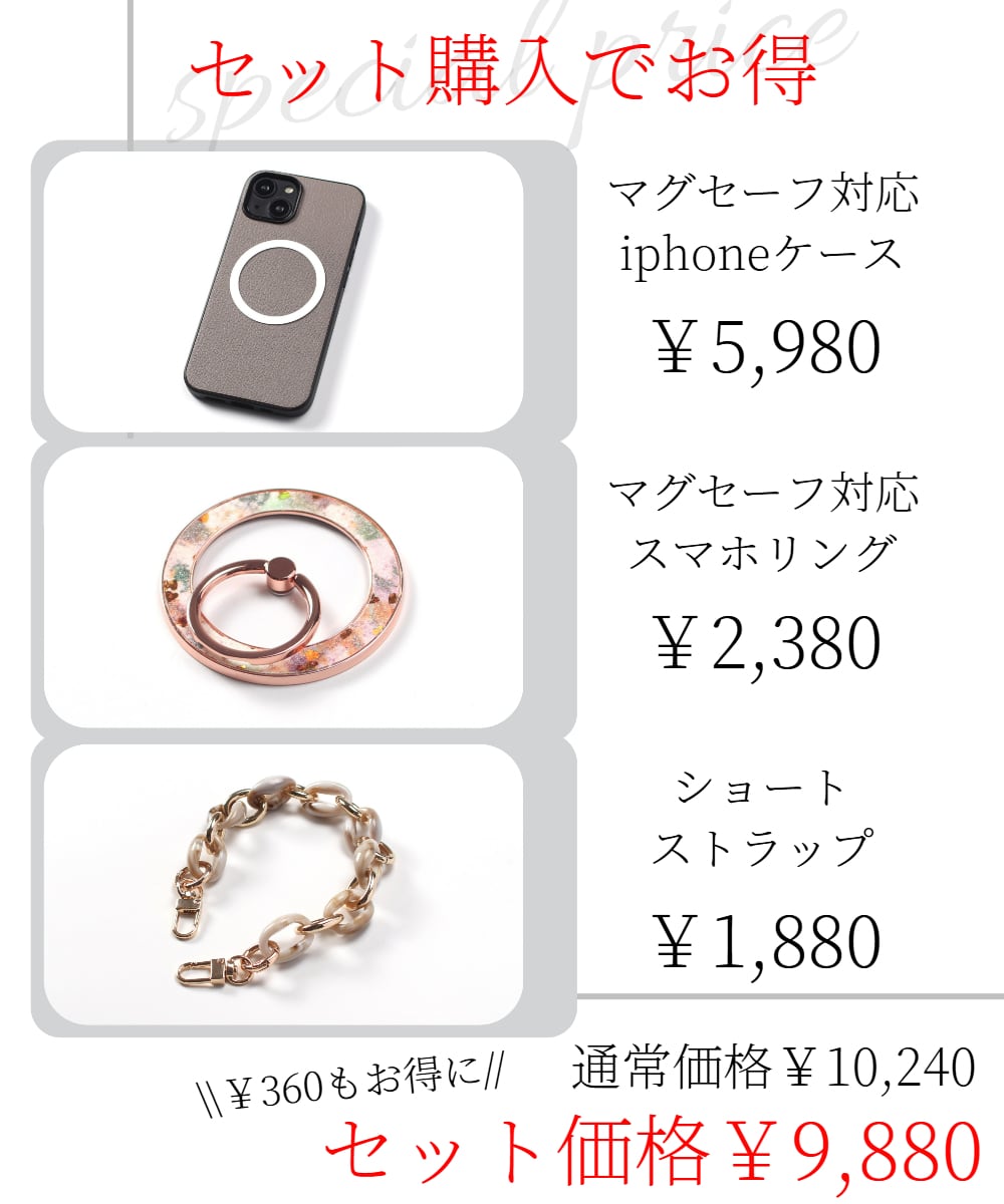 単体でマグセーフ対応iphoneケースとスマホリング・ショートストラップを購入すると¥10,240ですが、