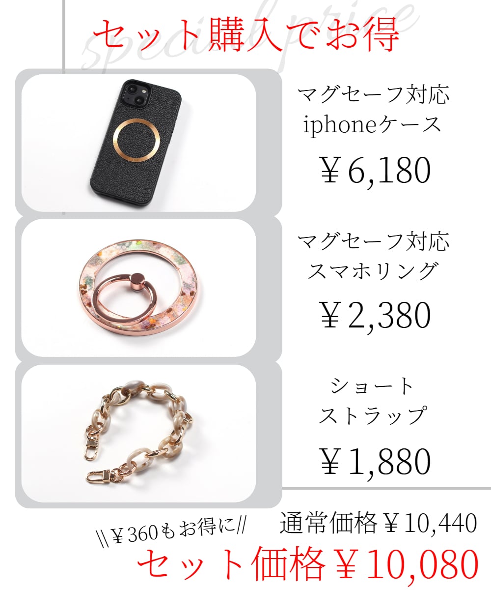 単体でマグセーフ対応iphoneケースとスマホリング・ショートストラップを購入すると¥10,440ですが、