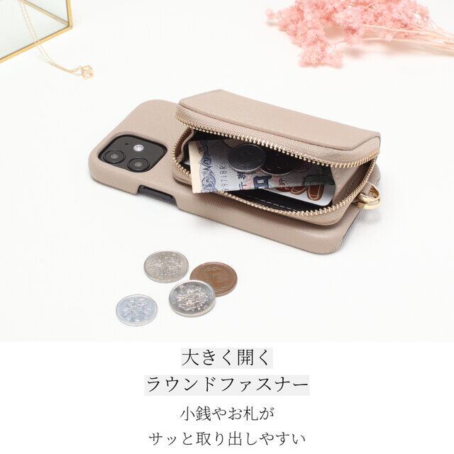 スマホケースにはラウンドファスナーで開閉出来るお財布付き